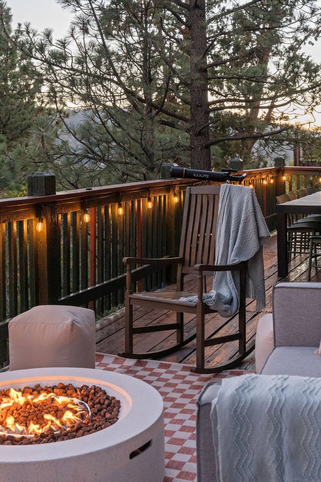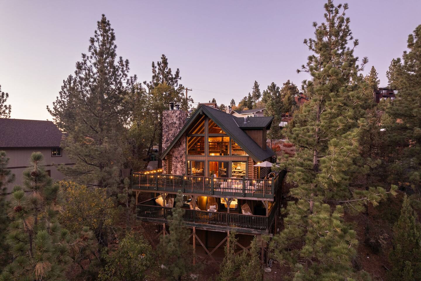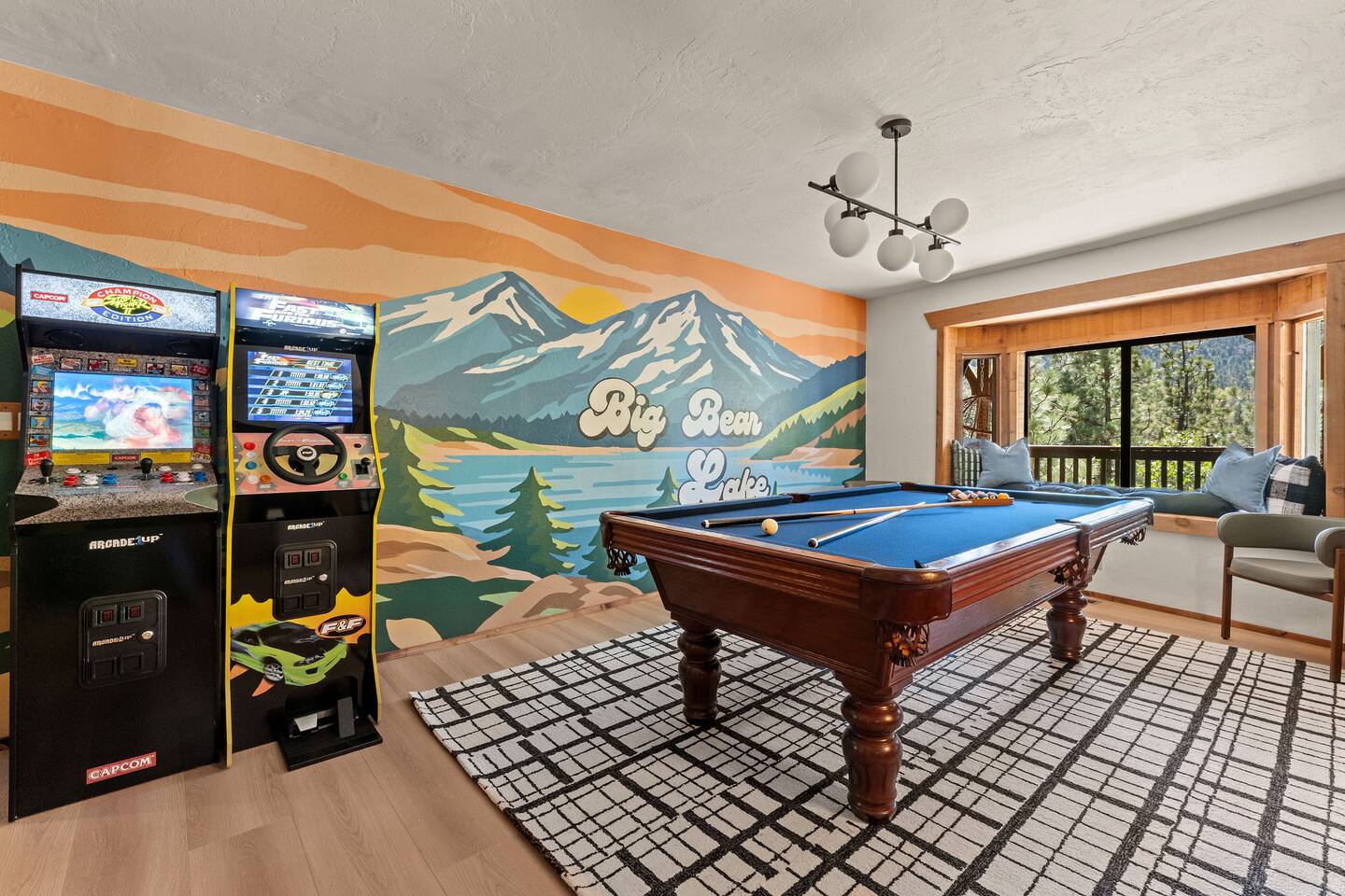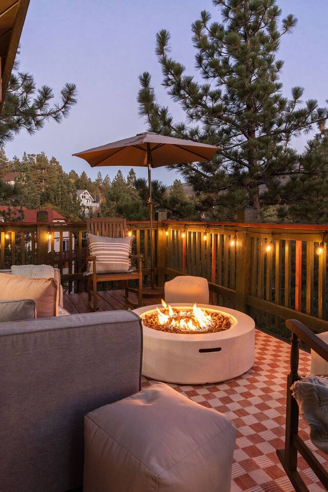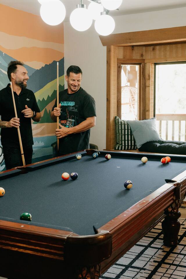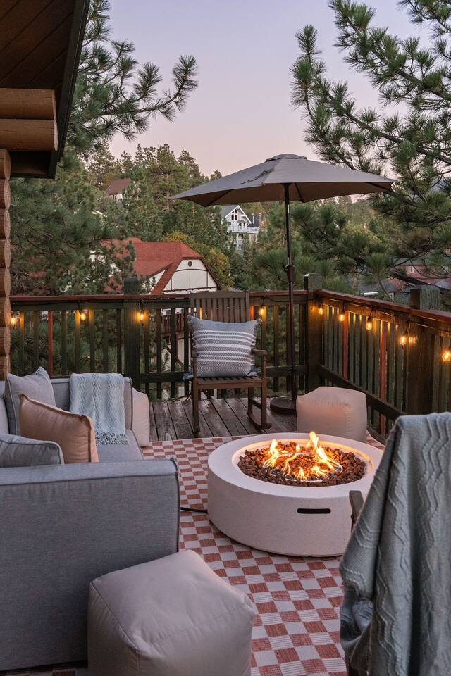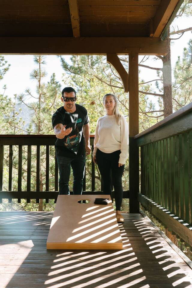 Pet friendly with pet fee - Pet MUST be on the reservation The home provides 5 bedrooms (one being the Bunk Room) and 3 bathrooms. 2 King Sized Beds 2 Queen sized beds 4 Beds in bunkroom (2 bunks with a top and bottom bed - Lower beds are Queen, upper beds are Twin XL) Bathrooms: 3 bathrooms total 1 bathroom on the main level with a tub, 1 bathroom with shower on the loft/upper level, and 1 bathroom with shower on the lower level. Outdoor space includes: Upper Deck: 10 person dining table 2 Rocking Chairs, 4 outdoor ottomans, and an outdoor sofa centered around a propane firepit Large grill String lights for charming ambiance Lower Deck Brand new Bullfrog spa, towel rack, string lights, and 2 lounge chairs 4 hanging egg chairs with pillows and blankets Giant Jenga and Cornhole games stored in our oversized deck box Highlights: 1. HUGE A-FRAME WINDOWS WITH INCREDIBLE VIEWS: You will feel as if you're living among nature with the gorgeous panoramic views and natural light flooding in through the massive windows. Sip some coffee or hot chocolate by the window with a view straight to the Bear Mountain ski slopes. 2. FULLY STOCKED KITCHEN: Our kitchen provides all the amenities for breakfast, lunch or dinner. It features modern appliances, a brand new dishwasher, and a 6-burner gas stovetop - allowing you to prepare delicious meals with ease. Whether you're cooking up a hearty breakfast before heading out to the slopes or whipping up a gourmet dinner to enjoy together. 3. PRIME LOCATION: Located just 1.5 miles from Bear Mountain Ski Resort, 1.7 miles from Big Bear Alpine Zoo, and 1.8 miles from popular breakfast spots Moonridge Coffee and Dank Donuts. Vons and Stater Brothers grocery stores are just around the corner a few miles away and it's a short 10-12 minute drive to the Village and Lake. 4. WHOLE HOUSE GENERATOR: As you may know, Southern California is known to have some Public Safety Power Shutoffs that can put a damper on the fun when the power goes out. Our whole house generator will kick on when the power shuts off to keep the heat on, the hot tub hot and the movies playing. 5. EV CHARGER: Don't stress about where you'll get your next charge from, we've got you! Just bring your car-specific cable and plug right in! 5. ULTIMATE RELAXATION & ENTERTAINMENT: We've gone above and beyond to make your stay truly exceptional. Our property features top-of-the-line amenities, including: a) New Bullfrog spa: Take a break from the brisk weather and soak up the relaxation , or hang out in the tub while watching a sports game on the outdoor TV. b) Pool table, 3 arcade games, and board games: Rack up for a friendly pool competition, or power up the classic arcade games with Street Fighter II, Fast and Furious, or PacMan. The Colusade has everything you need to keep the whole family entertained. c)TVs in EVERY ROOM: Enjoy watching our smart tvs in every bedroom and the bunkroom, the living room, the game room, and by the hot tub. This way you never have to fight for what you want to watch. d) Fun for the littles: From connect 4 and basketball connect 4 in the bunk room to train sets, memory games, and tumbling blocks in the loft - we've got you covered! e) Outdoor Dining and Entertainment: Create the ultimate dining and social experience outside with a large grill, string lights, plenty of seating, and a view worth spending time with. Whether you're planning a family trip, a reunion, or a trip with friends to relax and unwind, The Colusade is guaranteed to delight and designed to entertain all. Book your stay with us today and experience the perfect mix of retro, rustic and modern luxury City of Big Bear Lake Rental Permit 2025-1905 Guest access: Guest will have private access to the entire house. There is keyless entry for easy access and check in. Other things to note Check-in is at 4pm Check-out is at 10am